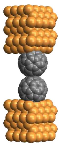 | Electron current through two C60-molecules which are contacted with elec-trodes. As they are only one billionth of a meter in diameter, ultra high precision is needed in order to control their distance. Copyright: CAU, Source: prl.aps.org |