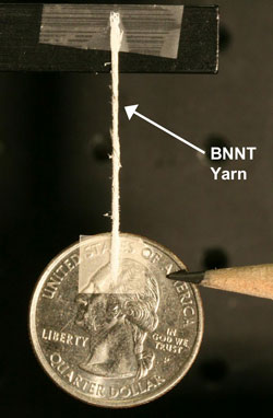 | A yarn spun of boron-nitride nanotubes suspends a quarter. |