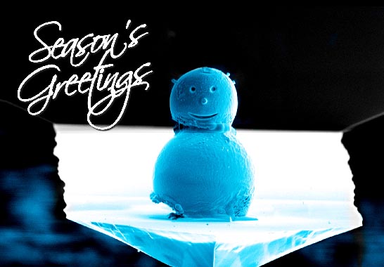 The snowman was made from two tin beads used to calibrate electron microscope astigmatism. The eyes and smile were milled using a focused ion beam, and the nose, which is under 1 µm wide (or 0.001 mm), is ion beam deposited platinum.