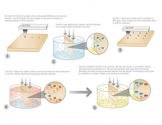 The new technique produces multiple chemical patterns on the same chip by using the AFM to heat a polymer film and change its reactivity. The chip is then dipped into a solution, which allows chemicals (for example, proteins or other chemical linkers) in the solution to bind to the chip on the parts where it has been heated. The AFM then heats the film in another spot. The chip is dipped into another solution and again another chemical can bind to the chip.