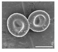 | Biocompatible synthetic red blood cells (sRBCs) synthesized by the UCSB team, where the shell is composed of alternate layers of hemoglobin and BSA. (Scale bar, 5 microns) |
