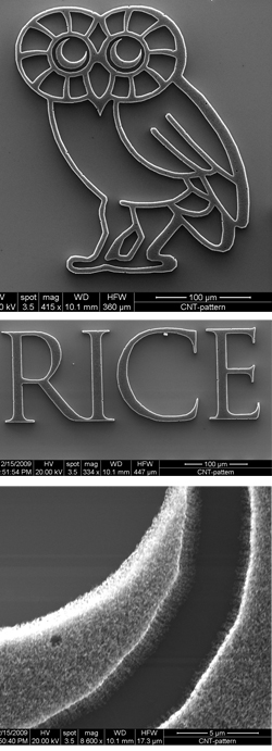 The first nano-owls were designed by Yao, a student in the labs of James Tour, Doug Natelson and Lin Zhong, and grown by Alvarez, who recently earned his doctorate at Rice, to accompany the latter's thesis presentation. "I really wanted to use the Rice logo made of nanotubes on one of my slides for the Ph.D. defense committee, and we finished it in time, but the electron scanning microscope was broken," he recalled.
