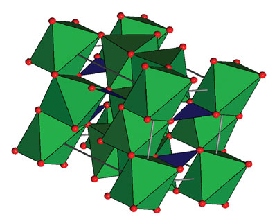 | A representation of the mineral kotoite's crystal structure. The oxygen atoms are red, and the magnesium atoms are located at the centers of the green octahedra. The boron atoms are located at the centers of the blue triangles connecting the oxygen atoms. Derek Stewart. |