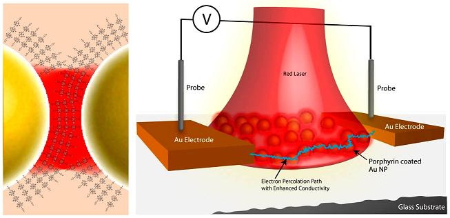 Investigators in the Nano/Bio Interface Center at the University of Pennsylvania have demonstrated a new mechanism for turning light into electrical current in porphyrin molecules. They fabricated an array of gold metal nanoparticles and linked them with special light-sensitive porphyrins. The plasmons at the surface of the nanoparticles focus the light to the junction where the molecules are connected. The plasmon effect increases the efficiency of current production in the molecule by a factor of 4-20 (400% to 2000%) that is then transported through the network to the outside world.