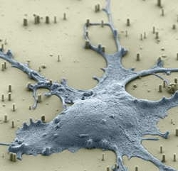 | Scanning electron microscope image (false color) of a rat hippocampal neuron on a bed of vertical silicon nanowires. Nanowires penetrate the cell membrane without affecting cell viability, and can be used to efficiently deliver a wide variety of molecules into the cell's cytoplasm.Scanning electron microscope image (false color) of a rat hippocampal neuron on a bed of vertical silicon nanowires. Nanowires penetrate the cell membrane without affecting cell viability, and can be used to efficiently deliver a wide variety of molecules into the cell's cytoplasm. Courtesy: H. Park |