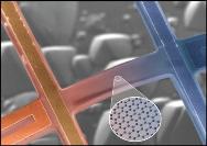| A one-atom thick sheet of graphene (highlighted in the circular window) on top of a silicon dioxide support proves to be an excellent thermal conductor, according to new research published in the journal Science. Although the interaction with the silicon dioxide suppressed the thermal conductivity of graphene compared to its freestanding form, supported graphene still demonstrated much higher heat conducting capability than silicon and copper nanostructures. This finding combined with graphene's superior strength and electron mobility make it a promising candidate for use in next-generation nano-electronic devices. |