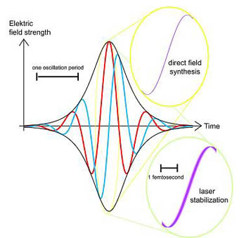 Light is an electromagnetic wave of very high frequency. In the visible domain, a single oscillation of the electric field only takes about 1200-2500 attoseconds. Consequently, an ultrashort laser pulse is comprised of a few of these oscillations. However, pulses from conventional short-pulse laser sources exhibit strong fluctuations of the positions of the field maximum relative to the pulse center. For maximum field strength, the center of the pulse has to coincide with a maximum of the electric field, as shown in Fig. 1 as a red curve. Consequently, methods have been developed to stabilize the position of the field maximum, i.e., the phase of the pulse.