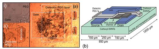 Ultimately, for building transistors, the team used two of the four studied mixtures of functionalized nanotubes as their building blocks. Nanotubes for conductive channels were treated with polyethylene glycol (PEG) while source, drain and gate electrodes were printed with carboxylated nanotubes. A layer of PEG was used as the gate dielectric.