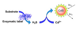 Valery and and co-workers utilise the fact that alkaline phosphatase (ALP) can induce the formation of H2S. In the presence of cadmium cations, H2S reacts to yield CdS quantum dots that show a characteristic fluorescence, dependent on the concentration of enzyme or substrate. The formation of CdS quantum dots can be measured by fluorescence spectroscopy and represents an alternative to other analytical methods.