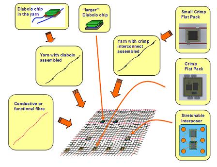 The PASTA project will combine research on electronic packaging and interconnection technology with textile research to realize an innovative approach of smart textile. By introducing new concepts for electronic packaging and module interconnect, a seamless, more comfortable and more robust integration of electronics in textile will be possible. The main technological developments will concentrate on a new concept for bare die integration into a yarn (by means of micromachining), a new interconnect technology based on mechanical crimping, and the development of a stretchable interposer serving as a stress relief interface between the rigid component and the elastic fabric. The technologies will also be assessed in a functional evaluation and reliability testing program. The proposed solutions for integration of electronics in textile will cover a whole range of components, from ultra-small LEDs to complex multichip modules. Moreover, a system design task will tackle the power distribution and system partitioning aspects to provide a complete solution for integration of a distributed sensor/actuator system in fabric.