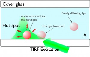 BEAST starts with the submerging of a sample in a solution of freely diffusing fluorescent dye. Since the diffusion of the dye is much faster than the image acquisition time (0.1 milliseconds vs. 50-to-100 milliseconds), the fluorescence produces a homogeneous background. When a dye molecule is adsorbed onto the surface of a hotspot, it appears as a bright spot in images, with the intensity of the spot reporting the local field strength.