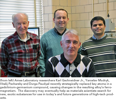 The group was led by Vitalij Pecharsky, Ames Lab senior scientist and Distinguished Professor of Materials Science and Engineering at Iowa State University, and included his Lab colleagues, Karl Gschneidner Jr., Ames Lab senior metallurgist and Distinguished Professor of MS&E at ISU, and Gordon Miller, Ames Lab senior scientist and ISU professor of chemistry, along with assistant scientists Yaroslav Mudryk and Durga Paudyal. Also participating was Sumohan Misra, research associate at the DOE's SLAC National Accelerator in Menlo Park, Calif., formerly a Ph.D. student of Miller's.