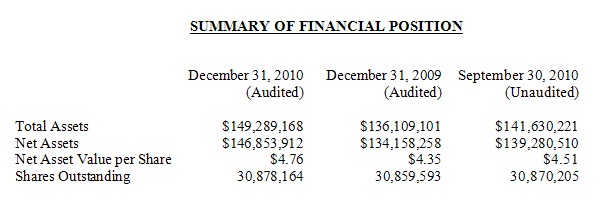 Harris & Harris Group, Inc. (Nasdaq: TINY), reported today that, as of December 31, 2010, its net asset value and net asset value per share were $146,853,912 and $4.76, respectively. The Company's Annual Report on Form 10-K may be accessed at www.hhvc.com/financials.cfm.