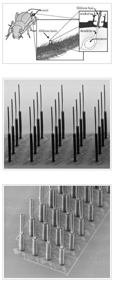 The synthetic cricket hair is an example of biomimicry, the hairs on a cricket's abdomen - on the projections known as 'cerci' - form the source of inspiration. These hairs enable the cricket to feel/hear the approach of its enemies and estimate their distance and direction unerringly. These characteristics can be simulated by making a hair that is suspended in a flexible microsystem. The hair is made of polymer SU8, is 0.9 millimetre in length and is thicker at the base than at the top. The smallest movements are registered by the flexibly-suspended plate to which the hair is attached; the electrical capacity changes as a result and gives a measure for the movement.