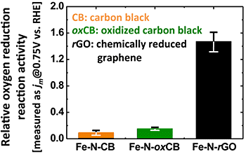 | The graphene-based catalyst Fe-N-rGO has a much higher oxygen reduction reaction catalytic activity than those based on carbon black or oxidized carbon black. |