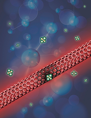 When the glowing nanotubes are exposed in water to different chemicals, the researchers saw that certain spots of the tube would briefly go dim as the molecules bombarded the surface. This allowed them to determine how effectively certain molecules would stick to the surface. The researchers were also able to track the motion of molecules as they moved along the surface. The team is now examining how chemical reactions proceed on nanotube surfaces to better understand chemistry at the water interface forbiological and chemical applications.