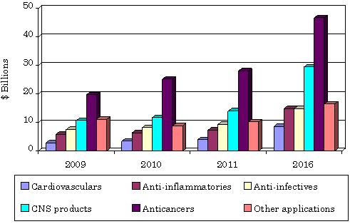 The largest segment, comprised of anti-cancers, was worth $28 billion in 2011, and after increasing at a CAGR of 10.8%, should be worth $46.7 billion in 2016.