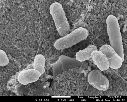 | A scanning electron microscope image of E. coli O157:H7 bacteria captured on the surface of a biosensor chip. Photo courtesy of Evangelyn Alocilja laboratory |