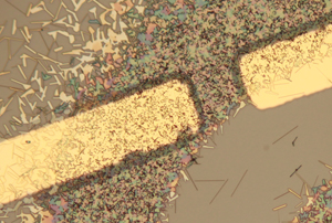 | Gold electrodes rest on clumps of vanadium oxide (VO2) wires that are each about 1,000 times smaller than a human hair. When baked in the presence of hydrogen gas, the wires next to the electrodes (dark region) absorb hydrogen and exhibit altered electronic behavior. CREDIT: Jiang Wei/Rice University |