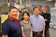 | University of Georgia researchers, left to right, Yao-Wen Huang, Jing Chen, Yiping Zhao and Justin Abell stand in front of an electron beam evaporator at the UGA Nanoscale Science and Engineering Center. The instrument, designed and created by the UGA Instrument Shop, is used to deposit silver nanorods 1,000 times finer than the width of a human hair on a chip that can be used to detect viruses, bacteria and chemical contaminants. |