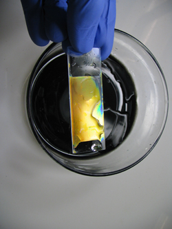 The researchers exposed their films to various solutions and found different colors depending on how much solvent was taken up by the P2VP layers. For example with a chlorine/oxide/iron solution that is not readily absorbed by the P2VP, the film is transparent, Thomas said. "When we take that out, wash the film and bring in a new solution with a different ion, the color changes."