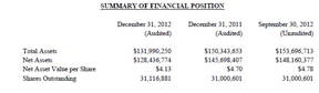 Harris & Harris Group, Inc. (Nasdaq: TINY), reported today that, as of December 31, 2012, its net asset value and net asset value per share were $128,436,774 and $4.13, respectively. The Company's Annual Report on Form 10-K may be accessed at http://ir.hhvc.com/sec.cfm .