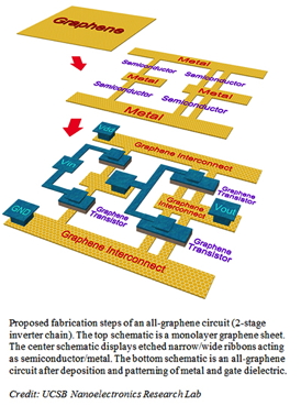 Researchers in electrical and computer engineering at UC Santa Barbara have introduced and modeled an integrated circuit design scheme in which transistors and interconnects are monolithically patterned seamlessly on a sheet of graphene, a 2-dimensional plane of carbon atoms. The demonstration offers possibilities for ultra energy-efficient, flexible, and transparent electronics.