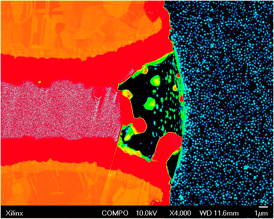 The second image, "Stars Reflected in an Astronaut's Helmet," was pseudo-colored and resembles a painting of an astronaut looking out into starry space. In reality the image is of a cross section of a microbump that reveals a void in the solder. It was submitted by Doug Hamilton of Xilinx in San Jose, California, and was also taken with a field emission SEM.