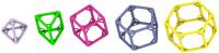 | The five cage-shaped DNA polyhedra here have struts stabilizing their legs, and this innovation allowed a Wyss Institute team to build by far the largest and sturdiest DNA cages yet. The largest, a hexagonal prism (right), is one-tenth the size of an average bacterium.