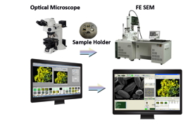 The Nikon ECLIPSE LV-N series optical microscope and any of the JEOL JSM-7000 series Field Emission SEMs work concurrently as the optical image taken on the OM, along with specimen stage coordinates, are transferred to the SEM for navigation and correlation via Nikon's Elements software. When the sample holder is moved to the SEM, the researcher can observe detailed structures at higher magnifications and easily compare to the optical image on screen.