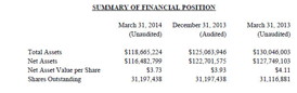 Harris & Harris Group, Inc. (Nasdaq: TINY), reported today that, as of March 31, 2014, its net asset value and net asset value per share were $116,482,799 and $3.73, respectively.