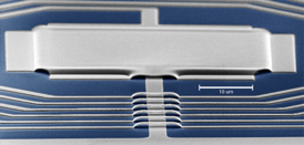 | The tiny aluminum device—only 40 microns long and 100 nanometers thick—in which Caltech researchers observed the quantum noise from microwaves. Credit: Chan Lei and Keith Schwab/Caltech |