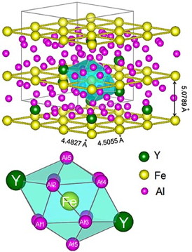 | Rendering of the near–perfect crystal structure of the yttrium–iron–aluminum compound used in the study. The two–dimensional layers of the material allowed the scientists to isolate the magnetic ordering that emerged near absolute zero. |