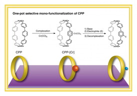 Selective monofunctionalizations of CPPs i.e. installation of one functional group at a single position on the arene ring, are difficult to achieve as all carbon-hydrogen bonds on the arene rings are chemically equivalent. Direct functionalization of metal-free CPPs usually leads to multiple substitutions on the arene rings in an uncontrolled manner. Despite CPPs being desirable components for carbon nanotubes, there has been no efficient method to obtain directly functionalized CPPs up to now.