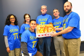 At the conclusion of the festivities, the students enjoyed 20 free pizzas, including a pie with pepperoni strategically placed in the shape of the Greek letter, "π," used to represent the ratio of the circumference of a circle to its diameter, which is approximately 3.14159. Pi Day is celebrated around the world on March 14 because the date—especially this year—roughly reflects this ratio (3/14/15). It is a day often used to promote STEM-based student learning, and provides SUNY PI another opportunity to share the exciting science and math-centered concepts that are critical for New York State's rapidly growing high-tech economy.