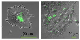 | This image shows fluorescent nanoparticles in cells. CREDIT: Elena Petersen |
