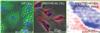| Fluorescence micrographs of fat and endothelial cells superimposed on differential-interference and phase-contrast images, respectively. The nuclei are stained blue in the micrographs. The image on the right is a picosecond-ultrasonic image of a single endothelial cell with approximately 1-micron lateral and 150-nanometer depth resolutions. Deep blue corresponds to the lowest ultrasonic amplitude. CREDIT: O. Wright/Hokkaido University |