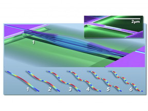 | Multimode nanoelectromechanical systems (NEMS) based mass sensor; the main figure schematically depicts a doubly-clamped beam vibrating in fundamental mode (1). Conceptual "snapshots" of the first six vibrational modes are shown below (1-6), colors indicate high (red) to low (blue) strain. The inset shows a colorized electron micrograph of a piezoelectric NEMS resonator fabricated in Caltech's Kavli Nanoscience Institute. CREDIT: M. Matheny, L.G. Villanueva, P. Hung, J. Li and M. Roukes/Caltech |