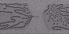 Long stripes of magnetic domains appear in the magnetic material on one side of a tiny channel. When the scientists applied an electric current to the metal layers, the stripes stretched through the channel and broke into tiny spherical skyrmion bubbles on the other side -- much like how children blow soap bubbles.