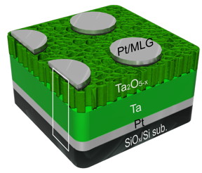 The layered structure consists of tantalum, nanoporous tantalum oxide and multilayer graphene between two platinum electrodes. In making the material, the researchers found the tantalum oxide gradually loses oxygen ions, changing from an oxygen-rich, nanoporous semiconductor at the top to oxygen-poor at the bottom. Where the oxygen disappears completely, it becomes pure tantalum, a metal.