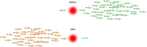 | This is an artist's rendition of what occurs when one photon goes through a carefully prepared atomic medium at the same time as a pulse including many photons. Change in the colors, represents nonlinear phase shifts picked up by each pulse that is proportional to the number of photons in the other pulse. A measurable nonlinear phase shift caused by a single photon on a pulse with many photons can enable deterministic two-qubit gates, an important missing part of the optical quantum information processing hardware. CREDIT: Amir Feizpour |