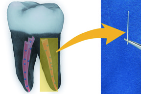 | American Chemical Society/Dong-Keun Lee A 3-D image of a tooth filled with nanodiamond-enhanced gutta percha, and an individual gutta percha point. |