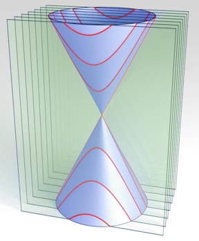 | This is a dirac cone showing a typical dispersion relation (energy vs. momentum) for 2-D graphene material. Red cross-sectional lines represent quantization of the energy (and momentum) due to a finite size constriction. CREDIT: B. Terrés, L. A. Chizhova, F. Libisch, J. Peiro, D. Jörger, S. Engels, A. Girschik, K. Watanabe, T. Taniguchi, S. V. Rotkin, J. Burgdörfer, C. Stampfer |