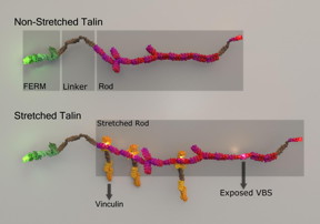 | Talin stretching and stretch-induced vinculin binding. CREDIT: Mechanobiology Institute, National University of Singapore |