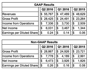 Revenues for the second quarter of 2016 were $55.8 million, up 17.4% from $47.5 million in the first quarter of 2016, and up 14.7% from $48.6 million in the second quarter of 2015. On a GAAP basis, gross margin was 51.0%, compared to 51.6% in the prior quarter and 47.8% in the year-ago period. Operating income was $7.3 million, compared to $3.7 million in the prior quarter and $2.5 million in the year-ago period. Net income was $6.0 million or $0.24 per diluted share, compared to $3.5 million or $0.14 per diluted share in the prior quarter, and $1.3 million or $0.06 per diluted share in the second quarter of 2015.