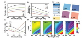 | Fig. 1 (a) Calculated refractive index and (b) extinction coefficient spectra of Ge with four different porosities (Pr) (0%, 40%, 60% and 75%) as a function of wavelength. (c) Left, schematic view of proposed thin-film coatings with different Pr (i.e. 0%, 40%, 60% and 75%). Right, thin-film structures represented by calculated colors with different Pr (i.e. 0%, 40%, 60% and 75%) at the same thickness of 20 nm. (d) Calculated reflectance spectra of ultra-thin optical coatings (Pr-Ge/Au) with different Pr. (e) Contour plot of reflectance variation for Pr-Ge/Au with four different Pr as a function of Ge thickness (tGe), and of wavelength. White dashed lines in each contour plot indicate variations in the resonance dip. (f ) Color representations from calculated reflectance in (e). CREDIT DGIST |