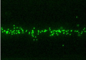 | Nanoparticles tagged with fluorescent markers to make them easier to see are concentrated in a column by a new acoustic whirlpool device. CREDIT Duke University |