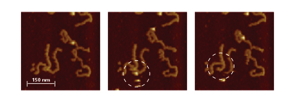 Figure caption: Frames from a movie of lambda digest DNA cleaved by DNAse1 enzyme. Imaged at a line rate of 625 Hz at 320×64 pixels for a frame rate of 8.7 fps with the Asylum Research Cypher VRS Video-Rate AFM.