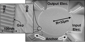 Researchers at University of California Berkeley demonstrated electrode-to-resonator gaps as small as 13.2nm achieved on a 59.5-MHz capacitive-gap transduced disk resonator which enabled a measured electromechanical coupling strength Cx/Co greater than 1.62% at a bias voltage of only 5.5V, which exceeds that of any competing technology, macro or micro, capacitive or piezoelectric, at similar VHF frequencies, all while retaining an unloaded quality factor Q of 29,640. Several key discoveries contribute to this successful demonstration, which include a novel polysilicon etch recipe that enables considerably smoother etch sidewalls than previously achievable, allowing more uniform sidewall sacrificial layer deposition and preventing structure pull-in by removing disparities and their associated strong electric fields. The implementation of small gap has improved the electromechanical coupling by more than 10x compared to previous resonators and its figure-of-merit measured as kt
