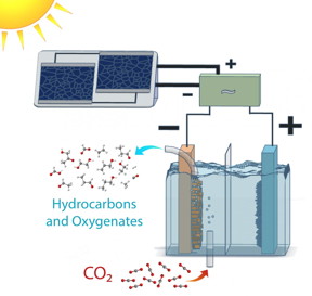 When the researchers coupled the electrodes to silicon photovoltaic cells, they achieved solar conversion efficiencies of 3 to 4 percent for 0.35 to 1-sun illumination. Changing the configuration to a high-performance, tandem solar cell connected in tandem yielded a conversion efficiency to hydrocarbons and oxygenates exceeding 5 percent at 1-sun illumination.